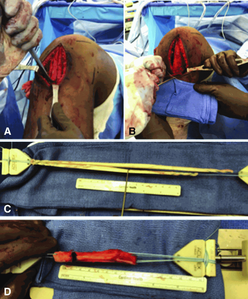 (A, B) Bone patellar tendon bone autograft harvest for posterior cruciate ligament graft and hamstring autograft harvest for ACL graft. (C) Hamstring allografts prepared for posterolateral corner and medial collateral ligament reconstructions. (D) Bone patellar tendon bone autograft preparation.