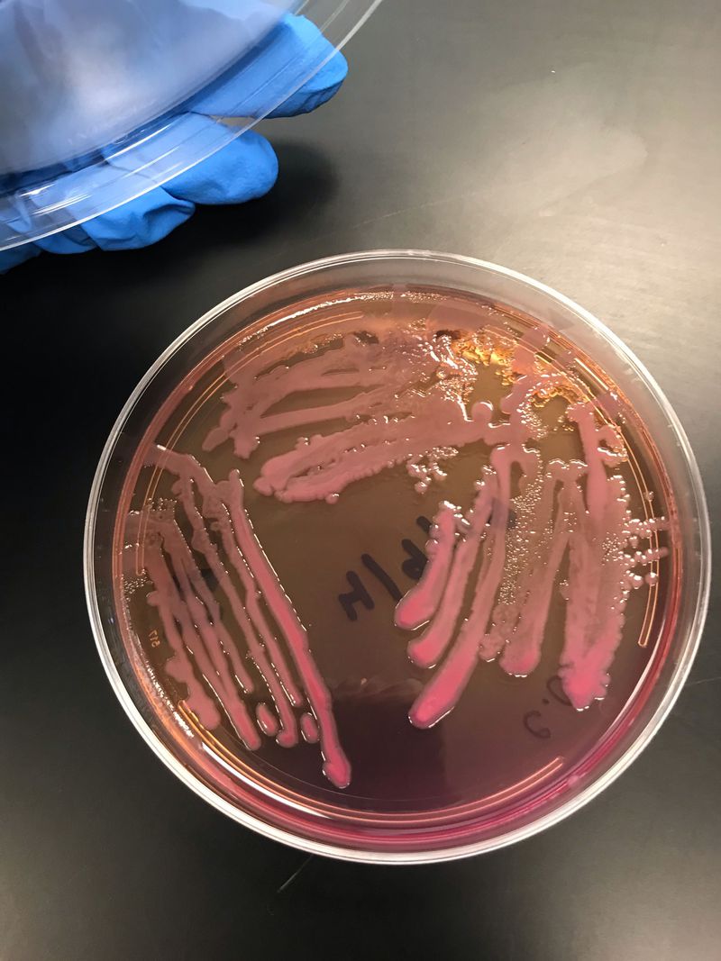 So, when grown on MAC, colonies of Gram-negative, lactose fermenting bacteria are pink. The intensity of the pink color corresponds to how good the bacteria are at eating lactose. Colonies of Gram-negative non-lactose fermenting bacteria grow in colorless colonies.