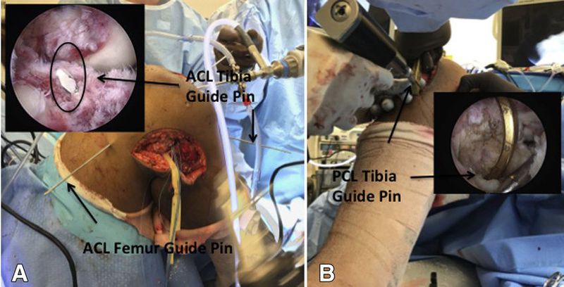 Intraoperative and correlating arthroscopic images of right knee. (A, B) Guide pins placed to planned tunnel locations: (A) anterior cruciate ligament tibial tunnel pin placement and (B) posterior cruciate ligament tibial tunnel under direct visualization through posteromedial portal.