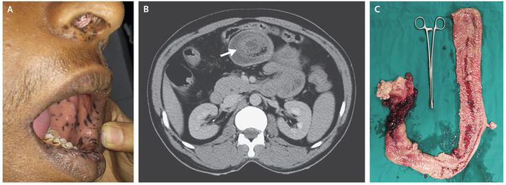 A 45-year-old man presented to the emergency department with sudden-onset abdominal pain and vomiting. On physical examination, his abdomen was diffusely tender, and he had hyperpigmented macules on the lips, oral mucosa, and nose (Panel A). His two sons had previously presented with abdominal pain due to intussusception and had undergone bowel resection. A computed tomographic scan of the patient’s abdomen showed a target sign (Panel B, arrow), which is characteristic of intussusception. Emergency laparotomy confirmed the presence of jejunojejunal intussusception with areas of necrosis. Multiple polyps were palpated throughout this section of the bowel. Because of the necrosis and concern about recurrence, the length of jejunum that contained polyps was resected (Panel C), and end-to-end anastomosis was performed. Histopathological evaluation of the resected segment revealed multiple hamartomatous polyps. On the basis of the mucocutaneous hyperpigmentation, multiple hamartomatous polyps in the gastrointestinal tract, and family history, a diagnosis of the Peutz–Jeghers syndrome was made. This autosomal dominant disorder is associated with an increased risk of gastrointestinal and extraintestinal cancers. The patient recovered well after the surgery and has undergone appropriate cancer-screening tests, which have been negative to date.