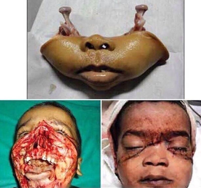 This boy was torn off the lower jaw due to a car accident. Surgeons performed surgery for 2 hours. The operation was successful