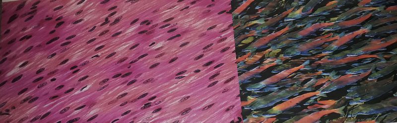 The left side shows the microscopic image of smooth muscles of human body and the right hand side shows a group of salmon fish in the river... What a similarity !!