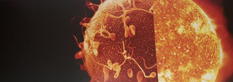The left side shows the sperms fertilizing an ovum and the right hand side shows the Sun... Isn't it similar??