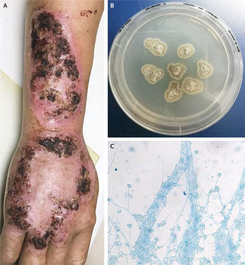 A 65-year-old man who was otherwise healthy presented to the dermatology clinic with a 5-month history of a progressively enlarging annular rash over his right hand and forearm. He worked as a farmer in southern China and noted that the erythema had developed after trauma to his hand from agricultural work. He had treated himself with a topical mixture of juices and fragments from herbs, but there was no improvement in his condition. Physical examination revealed large, nontender, annular areas of erythema over the dorsum of the right hand and forearm with ulceration and crusting (Panel A). A biopsy was performed, and fungal culture grew Sporothrix schenckii(Panel B shows a macroscopic view, and Panel C a microscopic view [lactophenol cotton-blue stain]), a finding confirmed by polymerase chain reaction. Sporotrichosis is a subacute-to-chronic infection caused by the dimorphic fungus S. schenckii complex, which is found worldwide. The infection usually involves the skin and subcutaneous tissue and occurs from inoculation of the fungus from plants and soil through the skin. Persons who are immunocompromised are at higher risk for disseminated disease. The patient was treated with itraconazole and terbinafine and local thermotherapy for 2.5 months. At follow-up 4 months after the completion of treatment, the erythema and crusting had resolved (Fig. S1 in the Supplementary Appendix,