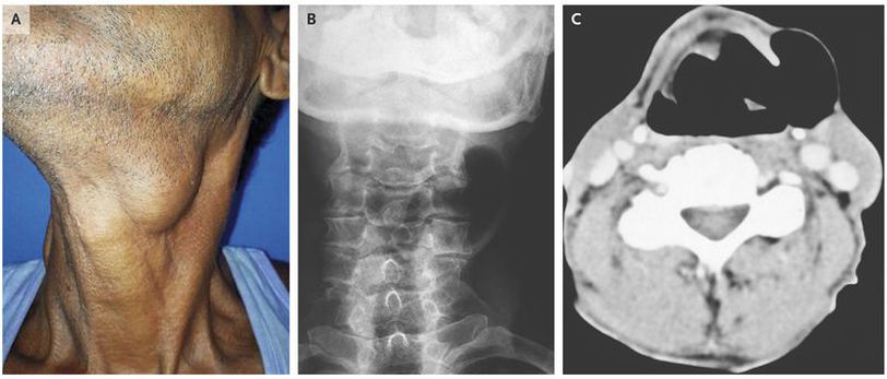 A 58-year-old man presented to the otorhinolaryngology outpatient clinic with a 2-year history of progressive hoarseness and swelling on the left side of his neck. He had no associated dysphagia, regurgitation of food, or dyspnea. He worked as a farmer and had no history of tobacco use. On physical examination, he had nontender, compressible swelling in the left cervical region that transmitted light on transillumination (Panel A). The swelling was accentuated when the Valsalva maneuver was performed Examination with a flexible fiberoptic laryngoscope showed a bulge over the left false vocal cord that was partially obstructing the airway lumen . A diagnosis of laryngocele was confirmed by radiography of the neck (Panel B) and by computed tomography (Panel C), both of which showed a well-defined lobulated structure located in the left paralaryngeal space and extending through the thyrohyoid membrane. A laryngocele is a dilatation of the laryngeal saccule within the sinus of Morgagni, the space between false and true vocal cords. It can result from activity that increases intralaryngeal pressure, such as excessive coughing, straining, playing a wind instrument, or glass blowing. The patient underwent a complete excision of the laryngocele. He remained asymptomatic at a follow-up visit 8 months later.