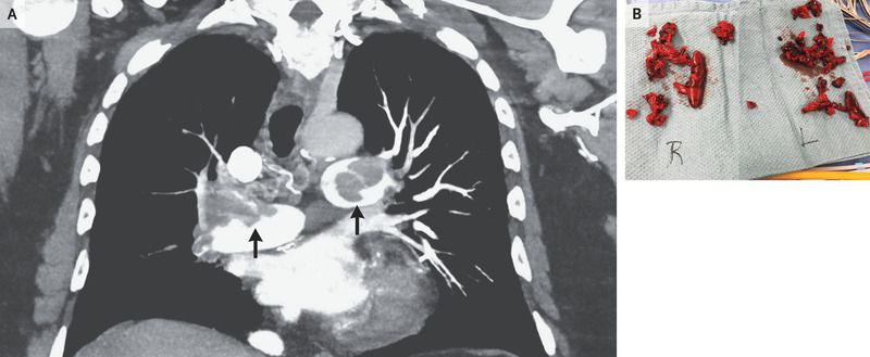 A 64-year-old man presented to the emergency department with a 2-week history of worsening shortness of breath. He had been in good health previously and had not undergone recent surgeries or had periods of prolonged immobilization. The oxygen saturation was 84% while he was breathing ambient air, and the blood pressure was 156/103 mm Hg. A physical examination was notable for swelling of the right calf. An electrocardiogram showed extreme right-axis deviation and T-wave inversions in the lateral leads. Computed tomography of the chest showed thrombus in both the right and left pulmonary arteries (Panel A, arrows), as well as a linear density in the right ventricle. Transthoracic echocardiography confirmed the presence of a 6-cm thrombus in the right ventricle Duplex ultrasonography showed extensive deep venous thrombosis in the right leg. The patient underwent surgical thrombectomy, which resulted in reduction of an extensive clot burden (Panel B). He did well postoperatively and was treated with apixaban. At a follow-up visit 1 month after surgery, his oxygen saturation was 94% while he was breathing ambient air, and he had improving exercise capacity.