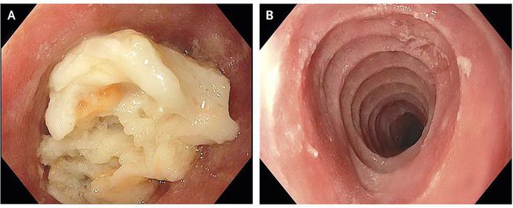 A 32-year-old man presented to the emergency department with difficulty swallowing oral secretions and the feeling that food was stuck in his throat after he ate a pizza roll. The patient reported that similar episodes had occurred previously, but in each instance the feeling resolved spontaneously, and he did not seek medical care. At the time of presentation, the patient was drooling. Upper endoscopy revealed impacted food material (Panel A) and prominent mucosal rings extending 20 cm from the incisors to the level of the gastroesophageal junction, with two discrete areas of narrowing and associated linear furrows (Panel B). Biopsy specimens were obtained, and esophagitis was observed, with more than 40 eosinophils per high-power field (Fig. S1 in the Supplementary Appendix). An endoscopic finding of fixed esophageal rings, or “trachealization,” is suggestive of eosinophilic esophagitis, although a definitive diagnosis is made on the basis of clinical presentation, histologic findings, and the exclusion of other causes of esophageal eosinophilia, such as proton-pump inhibitor–responsive esophageal eosinophilia. The patient was treated with an 8-week course of omeprazole, but there was no symptom resolution or histologic improvement on repeat endoscopic biopsies, which confirmed the diagnosis of eosinophilic esophagitis. He was started on an 8-week course of both swallowed fluticasone and a six-food elimination diet (elimination of the six most commonly identified types of allergenic food — wheat, milk, soy, nuts, eggs, and seafood). No additional endoscopies were performed after completion of treatment with fluticasone and the elimination diet. At a 1-year follow-up visit, the patient reported no further symptoms of food impaction.