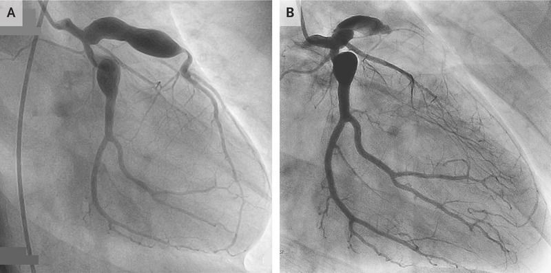 An 18-year-old man presented to the emergency department with chest pain. He had a history of Kawasaki’s disease, which had been diagnosed when he was 11 years of age. Despite treatment with intravenous immune globulin, coronary-artery aneurysms were detected on imaging (Panel A shows a coronary angiogram obtained 3 years before the current presentation). At the time of the current presentation, his medications included aspirin and warfarin. An electrocardiogram showed ST-segment elevations in leads V1 to V3. Emergency coronary angiography revealed occlusion of the left anterior descending artery (Panel B). Kawasaki’s disease is an acute, idiopathic, self-limiting vasculitis that primarily affects children. Clinical features include fever, nonexudative conjunctivitis in both eyes, mucositis, cervical lymphadenopathy, polymorphous rash, and changes in the hands and feet. Because not all these features are necessarily present and there is no specific diagnostic test for Kawasaki’s disease, the diagnosis may be missed in childhood or occur at such an early age that the adult patient has no recollection of illness. Affected children are at risk for cardiovascular complications. The patient underwent coronary-artery bypass surgery. At follow-up 3 years after presentation, he was doing well and had no further cardiac symptoms.