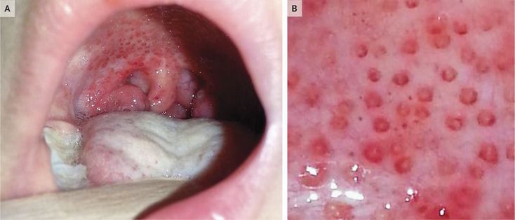 An otherwise healthy 9-year-old girl presented to the primary care clinic with a sore throat and fever. Her temperature was 38.5°C. Physical examination revealed swollen and tender cervical lymph nodes, an inflamed uvula, enlarged tonsils, and “doughnut” lesions on both the hard and soft palates (Panels A and B). A rapid antigen detection test for group A streptococcus was positive. Throat culture confirmed group A beta-hemolytic streptococcus. “Doughnut” lesions are erythematous papules with a pale center that may be present on both the soft and hard palates. The presence of these lesions is a clinical sign that has historically been associated with group A streptococcus pharyngitis. The patient was treated with a 10-day course of oral amoxicillin and recovered without complication.