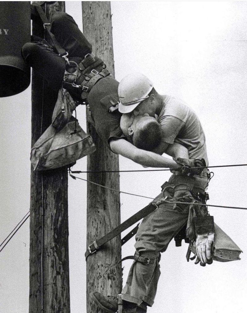 ⚡️Resuscitation at 20 feet above the ground!! A Pulitzer prize photo, and certainly worthy of that award... titled “Kiss of Life”, this photo shows a utility worker named J.D. Thompson giving mouth-to-mouth resuscitation to co-worker Randall G. Champion after he went unconscious following contact with a low voltage line at the top of a utility pole. They had been performing routine maintenance when Champion brushed one of the low voltage lines at the very top. Over 4000 volts entered Champion’s body and instantly stopped his heart (an electric chair uses about 2000 volts). His safety harness prevented a fall, and Thompson, who had been ascending below him, quickly reached him and performed mouth-to-mouth resuscitation. He was unable to perform CPR given the circumstances, but continued breathing into Champion’s lungs until he felt a slight pulse, then unbuckled his harness and descended with him on his shoulder. Thompson and another worker administered CPR on the ground, and Champion was moderately revived by the time paramedics arrived, eventually making a full recovery. Champion's injuries included a burn to his foot (the electrical current blew a hole where it came out his foot) that would require skin grafting and months of healing. What’s even more incredible is Champion not only survived this thanks to Thompson, but he lived an extra 35 years. He died in 2002 at 64 years old. Thompson is still alive today