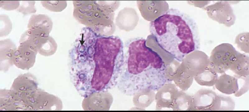 A 30-year-old man with human immunodeficiency virus (HIV) infection presented to the emergency department with a 2-week history of fever, bloody diarrhea, and generalized weakness. He had discontinued antiretroviral therapy 3 months before presentation and then had spent 2 months in French Guiana. On physical examination, the patient was febrile, pale, and cachectic. Laboratory findings showed pancytopenia, a CD4+ cell count of 6 per cubic millimeter, and a C-reactive protein level of 239 mg per liter (reference range, 0 to 5). Giemsa staining of a peripheral-blood sample revealed numerous myeloid cells containing intracytoplasmic yeast-like forms (arrow), a finding consistent with Histoplasma capsulatum. Disseminated histoplasmosis is an opportunistic infection; when it occurs in patients with HIV infection, it is typically seen in those with a CD4+ cell count of less than 150 per cubic millimeter. The patient was started on liposomal amphotericin B. His hospital course was complicated by hematemesis, and he died from complications of gastrointestinal hemorrhage. The diagnosis of disseminated histoplasmosis was confirmed with a positive result for H. capsulatum in peripheral blood and bone marrow aspirate on polymerase-chain-reaction analysis.