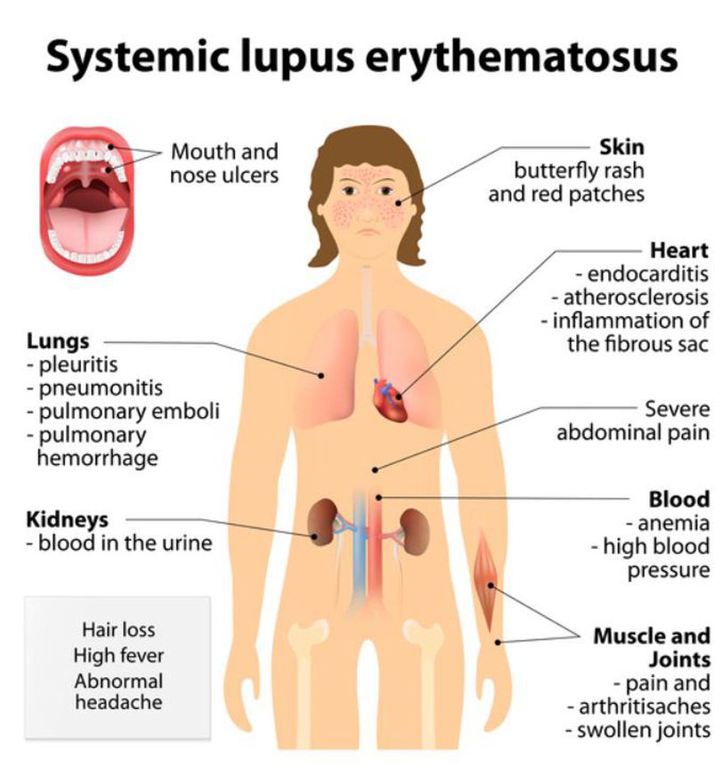 Systemic lupus erythematosus (SLE), also known simply as lupus, is an autoimmune disease in which the body's immune system mistakenly attacks healthy tissue in many parts of the body. Symptoms vary between people and may be mild to severe.Common symptoms include painful and swollen joints, fever, chest pain, hair loss, mouth ulcers, swollen lymph nodes, feeling tired, and a red rash which is most commonly on the face.Often there are periods of illness, called flares, and periods of remission during which there are few symptoms. The cause of SLE is not clear.It is thought to involve genetics together with environmental factors,female sex hormones, sunlight, smoking, vitamin D deficiency, and certain infections