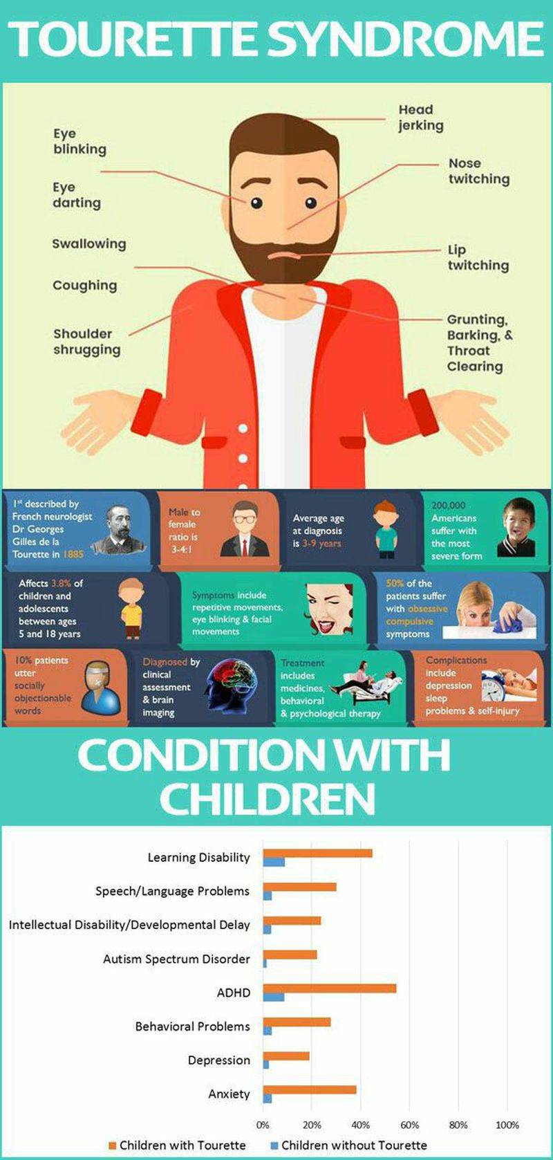 Tourette syndrome (TS or simply Tourette's) is a common neurodevelopmental disorder with onset in childhood, characterized by multiple motor tics and at least one vocal (phonic) tic. These tics characteristically wax and wane, can be suppressed temporarily, and are typically preceded by an unwanted urge or sensation in the affected muscles. Some common tics are eye blinking, coughing, throat clearing, sniffing, and facial movements. Tourette's does not adversely affect intelligence or life expectancy.