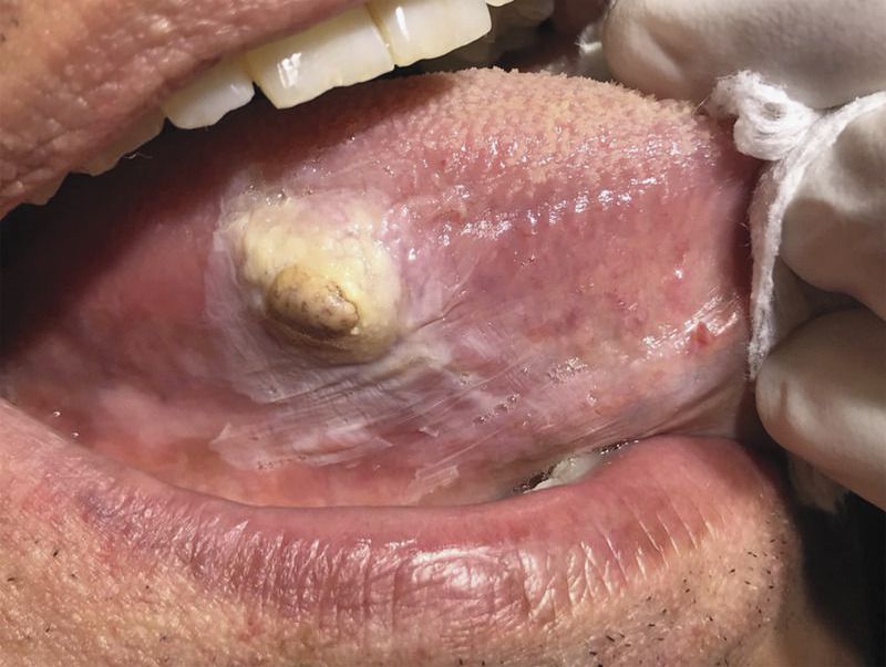 A 54-year-old man presented to the oral and maxillofacial clinic with a 2-month history of difficulty chewing his food. He reported that during the preceding 2 months, a painless brown lesion had grown on his tongue in the center of a white patch that had been present for years. He had no history of smoking and did not drink alcohol. Examination of the oral cavity revealed a well-circumscribed hard mass, measuring 8 mm by 7 mm and surrounded by a white patch on the right side of the tongue. He had no palpable cervical lymphadenopathy. An incisional biopsy of the lesion revealed a high-grade, undifferentiated spindle-cell sarcoma. Spindle-cell sarcoma is a rare connective-tissue tumor that can grow rapidly. The patient underwent surgery, including a hemiglossectomy, and received adjuvant chemotherapy. At follow-up 1 year after the completion of chemotherapy, he had no evidence of recurrence and reported some mild difficulty with swallowing.
