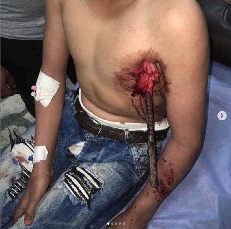 A 13-year-old boy appeared at the emergency room with a metal shaft penetrated from the armpit to the back of the neck, passed between the brachial plexus and the subclavian artery! The stem has been carefully removed and the patient recovered completely, with no motor and sensory deficit, intact lung, and no major vessel damaged!