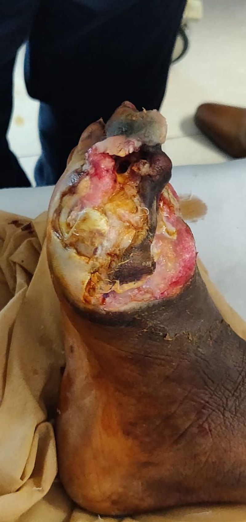 A 35 year old female was diabetic since 15yr and was unaware of it then she developed diabetic foot for last 3yr years when the wound became uncontrollable by her then she visited hospital for checkup. On lab testing she had elevated sugar level of 389 The wound was developed into wet gangrene no other choice was left but to do amputation from ankel...