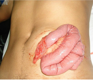 This was corrected via laparotomy and primary repair of intestinal injury.