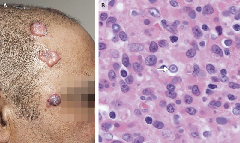 A 53-year-old man who had undergone both liver and kidney transplantation within the previous 2 years presented to the infectious diseases clinic with a 4-month history of progressively enlarging, painless nodules on his scalp (Panel A) and perianal region. He otherwise felt well. The immunosuppressive medications that he was receiving included tacrolimus, mycophenolate mofetil, and prednisolone. Four weeks before the development of the skin lesions, he had received pulse methylprednisolone for acute cellular rejection of the transplanted kidney. Biopsy of the lesions identified Michaelis–Gutmann bodies (basophilic inclusions) (Panel B, arrow), and cultures grew Escherichia coli and Pseudomonas aeruginosa. A diagnosis of malakoplakia was made. This rare chronic granulomatous condition, which occurs most frequently in immunocompromised patients, is thought to be due to defective intracellular killing of bacteria. It is characterized by focal inflammatory lesions with Michaelis–Gutmann bodies within macrophages. Cutaneous involvement is rare; the more typical presentation involves the kidney or bladder. Management combines prolonged antibiotic therapy, immunosuppression reduction, and sometimes surgical excision. The patient was treated with antibiotics, including ciprofloxacin, along with a concurrent reduction in immunosuppression. After 6 months of treatment, the lesions regressed, with some residual scarring.