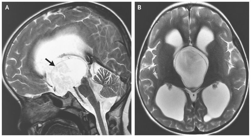 A 5-year-old girl presented to the pediatric neurosurgery clinic with a 2-year history of excessive head nodding. On examination, she was alert, with normal cognitive function. She displayed continuous, rhythmic, anteroposterior head-bobbing movements at a frequency of 2 to 3 Hz. The movements diminished in intensity when she engaged in volitional activity, such as talking. Magnetic resonance imaging of the head showed a well-defined, thin-walled, suprasellar cystic lesion (Panel A, arrow). The lesion caused obstruction at the foramina of Monro or at the third ventricle, with resulting ventriculomegaly (Panel B). A diagnosis of a suprasellar arachnoid cyst with bobblehead-doll syndrome was made. This is a rare pediatric movement disorder characterized by continuous or episodic involuntary head nodding at a frequency of 2 to 3 Hz. The movements stop during sleep and may disappear or attenuate with volitional activity. The syndrome is associated with cystic abnormalities in the region of the anterior third ventricle. The patient underwent endoscopic cystoventriculostomy and cystocisternostomy for the suprasellar arachnoid cyst. At follow-up 6 weeks after the procedure, she had partial resolution of her symptoms, with a reduction in both the frequency and intensity of head movements.