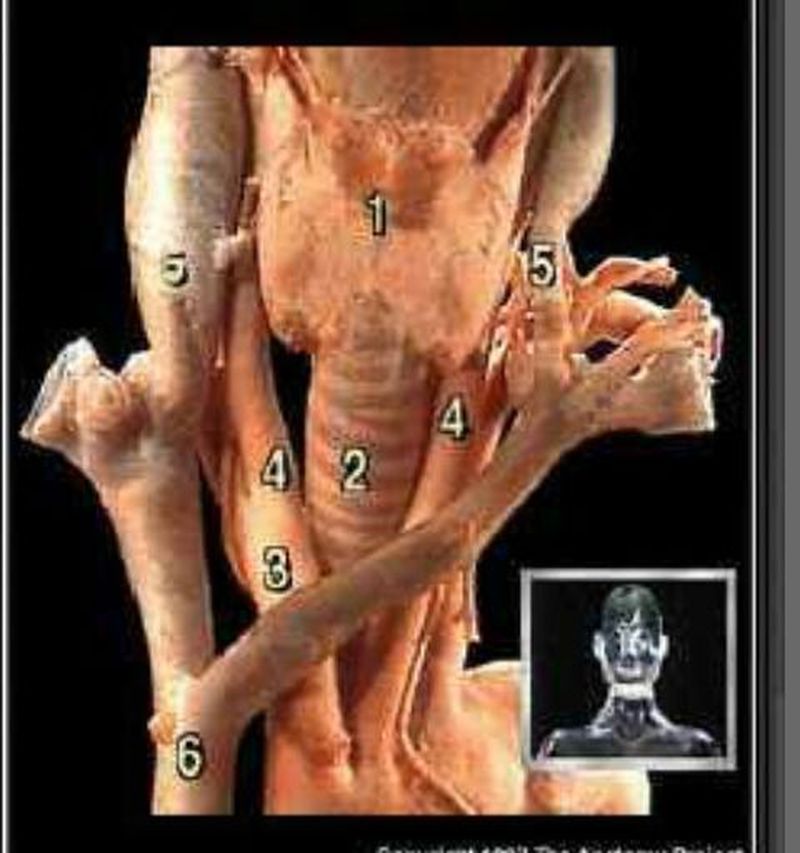 1-thyroid gland 2-trachea 3-brachiocephalic artery 4-common carotid arteries 5-internal jugular veins 6-superior Vena cava