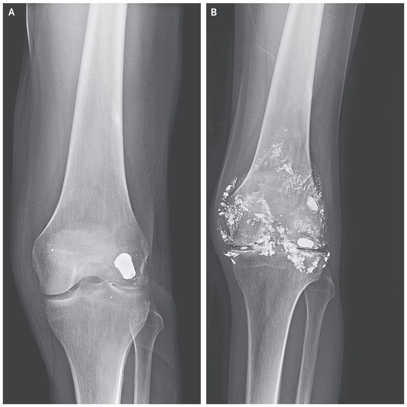 A 46-year-old man presented to the emergency department with worsening chronic left knee pain. Fourteen years before presentation, he had sustained a gunshot wound to the left knee. Radiographs obtained at the time of that injury showed a metallic bullet embedded in the posterior weight-bearing surface of the lateral femoral condyle and metallic debris within the joint (Panel A). No surgery was performed to remove the bullet at that time. At the current presentation, the physical examination was notable for a large effusion in the left knee. Repeat radiographs showed that, in addition to changes consistent with arthritis in the joint, the bullet had fragmented into metallic particles throughout the joint and synovium (Panel B). Laboratory studies revealed microcytic anemia, with a hemoglobin level of 9.1 g per deciliter (normal range, 12.9 to 16.8), and an elevated blood lead level (182 μg per deciliter [8.8 μmol per liter]). The Mini–Mental State Examination score was 24 (scores range from 0 to 30, with lower scores indicating poorer cognitive performance). The patient showed no other symptoms of chronic lead poisoning. Intraarticular bullets should be removed surgically at the time of the injury. In addition to causing joint damage, intraarticular bullets can fragment and dissolve in synovial fluid, leading to lead absorption and delayed symptomatic lead poisoning. The patient received chelation therapy. Surgical management with a left knee synovectomy was planned, but the patient left the hospital before surgery and was lost to follow-up.