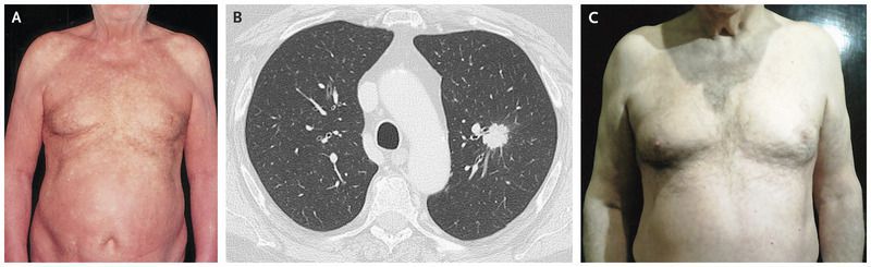 A 73-year-old man presented to the dermatology clinic with a persistent, generalized rash that had been present for 3 months and was associated with occasional itching. He had no history of any previous dermatoses or drug allergies; he was an active smoker, with a smoking history of 40 pack-years. Physical examination revealed a symmetric, generalized erythematous rash (Panel A), with overlying scaling and desquamation involving the hands and feet. He was initially treated with topical glucocorticoid therapy, then with oral prednisone and antihistamines, and then with intravenous glucocorticoids, but had no relief. Skin biopsy revealed a slight acanthosis and parakeratosis with a granulocytic infiltrate — findings that were consistent with an erythrodermic dermatitis. Given the patient’s smoking history and concern that there was an underlying neoplasm associated with the dermatitis, a radiograph of the chest was obtained, which showed an opacity in the left lung. Paraneoplastic erythroderma was suspected, and computed tomography of the chest confirmed the presence of a pulmonary nodule in the left upper lobe (Panel B). The patient underwent upper lobectomy of the left lung and lymph node dissection. Histologic examination revealed a moderately differentiated squamous-cell carcinoma. Paraneoplastic erythroderma is an uncommon initial manifestation of lung cancer. It can also be associated with hematologic cancers and other solid-organ cancers. One month after resection, the patient had complete resolution of the rash (Panel C). One year later, he had no further rash or tumor recurrence.