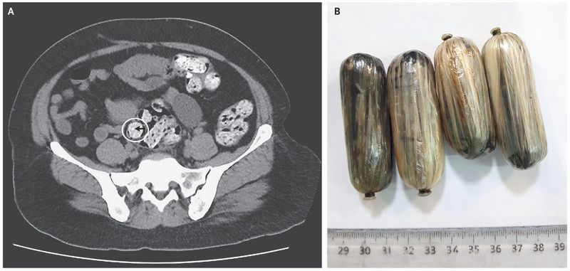 A 51-year-old woman was brought to the emergency department from a local international airport after reporting the ingestion of 30 packs of opium weighing 50 g each. The patient had no symptoms, and the results of physical examination were normal. Computed tomography of the abdomen and pelvis revealed several oval structures (Panel A, circle) with visible opacities (arrow); there was no evidence of bowel obstruction. Ingestion of lead-contaminated drug packs was suspected. Oral polyethylene glycol was administered, and the patient passed all packs (Panel B) without complication. Laboratory analysis of the contents of one pack confirmed the presence of opium; no other drugs were detected. The lead concentration in an opium sample was 3200 ppm. Because opium is often sold according to weight, heavy metals such as lead may be added to the opium during manufacturing or at the time of packing to increase its weight. Exposure to lead at such high concentrations can cause severe toxic effects that can manifest as neurologic and gastrointestinal signs and symptoms, including encephalopathy, altered mental status, seizures, abdominal pain, vomiting, constipation, and anorexia. The patient remained asymptomatic at the time of discharge, but the use and smuggling of lead-contaminated drugs is a public health concern