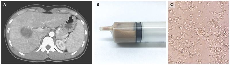 A 29-year-old man infected with the human immunodeficiency virus presented to the emergency department with a 2-day history of fever and pain in the right upper quadrant of the abdomen. His most recent CD4 cell count was 520 per microliter. Laboratory results showed an aspartate aminotransferase level of 208 IU per liter (reference range, 10 to 42), an alanine aminotransferase level of 467 IU per liter (reference range, 10 to 40), and a total bilirubin level of 2.4 mg per deciliter (reference range, 0.2 to 1.0). Computed tomography of the abdomen performed after the administration of contrast material revealed a ring-enhancing lesion in the liver that was suggestive of an abscess (Panel A). A reddish-brown material was obtained on percutaneous drainage of the abscess (Panel B). Microscopic examination revealed unicellular organisms with pseudopods (Panel C). An indirect hemagglutination test for antiamebic antibodies was positive, at a titer of 1:256. A polymerase-chain-reaction assay of stool confirmed infection with Entamoeba histolytica.E. histolytica infections result from the ingestion of amebic cysts. Contaminated food or water is typically the source. Metronidazole was administered for 2 weeks and was followed by 10 days of treatment with paromomycin to eliminate intracolonic cysts. The patient’s fever and abdominal pain subsided 2 days after the initiation of treatment, and the liver abscess had decreased in size on follow-up abdominal ultrasonography. At a 90-day follow-up visit, the patient had no further symptoms.