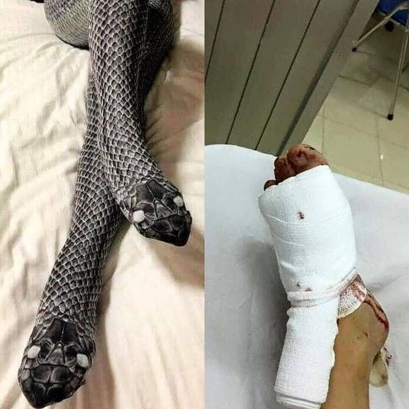 This photograph shows injuries sustained by a woman after her husband mistook her snake pajamas for an actual snake. This woman was sleeping in snake printed pajamas and her one foot was outside the blanket. Well, her husband thought it was snake and he broke her foot with an iron stick! She was immediately brought to the ER and examined by the doctors. They found several fractures in the tarsal bones of her foot, which were promptly treated. She is now on the road to recovery. Go to ➡ @medicaltalks NOW to see many more