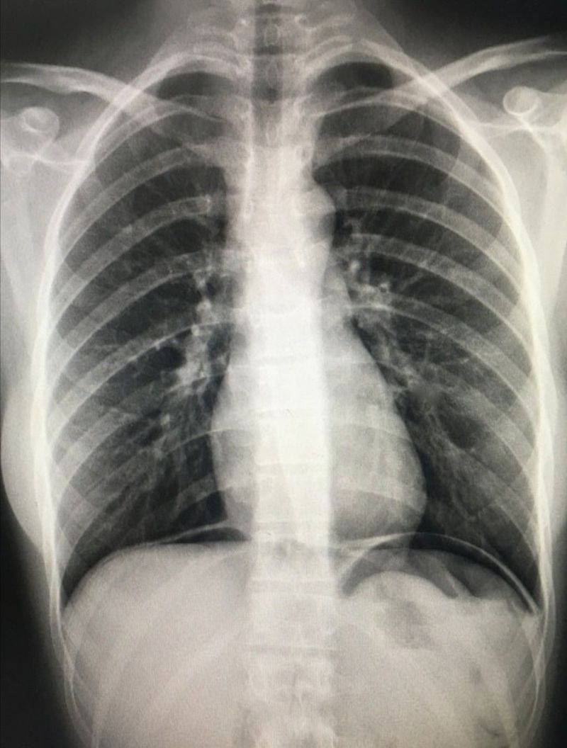 Yes. The answer is cupola sign- air under diaphragm. Sign of intestinal perforation; pneumoperitoneum.