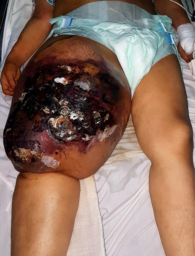 Leiomyosarcomas are soft tissue malignancies originating from smooth muscle often found in the uterus and digestive tract. Leiomyosarcomas develop at the level of the thigh are less frequent because the muscles of this region are striated muscles. This patient presented a leiomyosarcoma of the right thigh 3 years after a physical trauma, by direct shock, followed by a hematoma. The cause-and-effect relationship is controversial but very likely. Studies as well as case reports have connected soft tissue tumors to events of physical trauma. There is mounting evidence of inflammation as both an initiator and promotor of tumorigenesis, as well progression. Moreover, as the physiological response of tissue repair and regeneration is mediated through inflammation, it is not unlikely that physical injury may cause and/or contribute to tumor initiation, promotion and/or progression, not least when the subsequent inflammation becomes chronic. The patient presented to the emergency department at an extremely late stage, with a syndrome of tumor lysis, and malignant hyper-calcemia due to bone demineralization caused by the tumor. Treatment consists of amputation and can only be performed if the patient is biologically stabilized. Difficult access to care and lack of awareness are the main factors causing the emergence of patients in such a late stage. To limit the number of similar cases, patients should follow any swelling that had been growing steadily for several years with overlying skin changes and consult a doctor if persistent systemic symptoms appear.