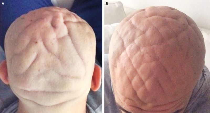 A 37-year-old man presented to the endocrinology clinic with a 4-year history of excessive sweating, headaches, and joint pain. His wife had also noticed increasing skin folds on his scalp. Physical examination showed thickening of the skin on his scalp with ridges and furrows (Panel A, back of head, and Panel B, top of head). He had enlarged feet and hands and a protruding lower jaw. Findings from laboratory evaluation were notable for an insulin-like growth factor I level of 907 μg per liter (reference range, 82 to 237) and a random measurement of the growth hormone level of 7.3 μg per liter (reference range, 0 to 0.8). A 75-g oral glucose load did not suppress the growth hormone level and confirmed a diagnosis of acromegaly. Magnetic resonance imaging of the head revealed a pituitary adenoma measuring 27 mm by 22 mm by 25 mm. The thickening and furrowing of skin on the scalp, called cutis verticis gyrata, can occur as an isolated finding or may be related to a number of conditions, such as acromegaly, as in this case. The patient underwent transsphenoidal resection of the pituitary adenoma. He had residual tumor and was treated with a somatostatin analogue and a growth hormone receptor antagonist. He received injections of soft-tissue fillers in an attempt to create a smoother appearance of the scalp, but the injections had only partial effect.