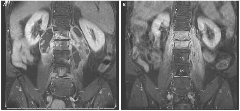 A 62-year-old man presented to the emergency department with a 6-month history of worsening low back pain, fevers, chills, night sweats, and weight loss. He regularly traveled to Mexico and had occasionally consumed unprocessed dairy products. He had no history of tuberculosis infection or known exposure. Laboratory studies revealed a white-cell count of 10,600 per cubic millimeter (reference range, 3700 to 10,500) and an erythrocyte sedimentation rate of 65 mm per hour (reference range, 0 to 15). Magnetic resonance imaging (MRI) of the lumbar spine with the use of gadolinium enhancement revealed findings consistent with spondylitis of the first through fifth lumbar vertebrae, as well as large psoas abscesses with multiple loculations (Panel A). Cultures from the blood and a psoas abscess grew Brucella melitensis; a mycobacterial culture was negative. B. melitensis is transmitted to humans from goats and sheep, typically through the consumption of unpasteurized dairy products in countries where this bacterium is endemic. A drain was placed, and the patient was treated with doxycycline with rifampin for 5 months. A repeat MRI scan obtained 3 months after the completion of treatment showed reduction of the psoas abscesses but continued enhancement of the first and second lumbar vertebrae (Panel B). The patient’s fever, night sweats, and low back pain resolved, the levels of inflammatory markers declined, and he remained symptom-free at follow-up 2 years later.
