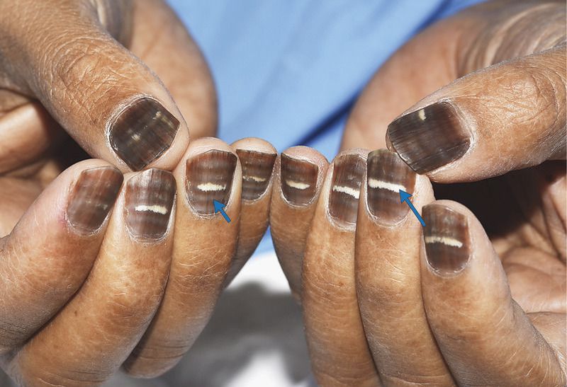 A 42-year-old man who was undergoing treatment for non-Hodgkin’s lymphoma presented to the oncology clinic with changes in his fingernails. Five months earlier, he had presented with gastric-outlet obstruction and had received a diagnosis of high-grade B-cell non-Hodgkin’s lymphoma. He then completed four cycles of chemotherapy, which had included rituximab, etoposide, prednisone, vincristine, cyclophosphamide, and doxorubicin. Physical examination showed diffuse, dark brown discoloration of his fingernails (melanonychia) and two types of transverse white lines that were not palpable. The serum albumin level was 2.5 g per deciliter (reference range, 3.5 to 5.0). The opaque-appearing transverse lines (long arrow) on the fingernails are called Mees’ lines (true leukonychia), and the more translucent-appearing lines (short arrow) are called Muehrcke’s lines (apparent leukonychia). Mees’ lines develop as a result of injury to the nail matrix, whereas Muehrcke’s lines are related to abnormal nail-bed vasculature. Therefore, Mees’ lines do not diminish with compression of the nail plate, and Muehrcke’s lines do. Multiple chemotherapy agents are associated with these nail changes. Muehrcke’s lines can also occur in patients with hypoalbuminemia. After six cycles of chemotherapy, the patient had remission of the non-Hodgkin’s lymphoma. Approximately 6 months after the completion of chemotherapy, the fingernail changes resolved completely.
