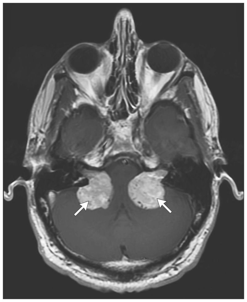 A 32-year-old man presented to the neurosurgery clinic with mild balance difficulties and hearing loss in the left ear. He had a family history of neurofibromatosis type 2 and a diagnosis of tumors in the right and left internal acoustic canals. He had not previously had symptoms related to the tumors (e.g., hearing loss or imbalance) and had been undergoing surveillance imaging of the brain since he was 16 years of age. Evaluation of the patient’s hearing revealed profound sensorineural loss on the left side and normal hearing on the right side. Magnetic resonance imaging of the brain performed after the administration of contrast material revealed tumors in both internal acoustic canals (33 by 26 by 31 mm on the left side and 32 by 28 by 30 mm on the right side), with extension in the cerebellopontine angles, and severe brain-stem compression. Bilateral vestibular schwannomas are a hallmark of neurofibromatosis type 2. In affected persons, there may be development of schwannomas on other cranial and peripheral nerves, meningiomas, ependymomas, and astrocytomas. Patients may have a parent affected with neurofibromatosis type 2, which is caused by mutations in NF2. These abnormalities are inherited in an autosomal-dominant manner, although de novo mutations may also occur. In this patient, left subtotal resection and stereotactic radiosurgical treatment of the left tumor were performed. Within 5 years and 11 months after initial presentation, the profound hearing loss in the left ear persisted, but the difficulties with balance had resolved. The patient continues to have annual hearing tests and MRI of the brain and has had no new symptoms at follow-up.