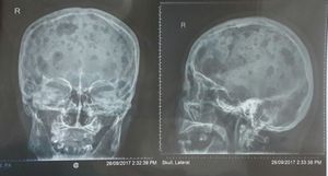 Multiple myeloma, defined as punchout lesions on the bones, in this picture the skull.