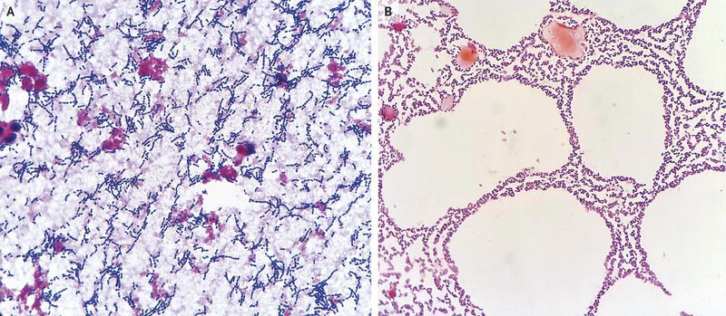 A 64-year-old man with human immunodeficiency virus infection, type 2 diabetes, and a history of splenectomy after trauma presented to the emergency department with confusion, headache, and fever. He had not been receiving regular medical care and took no medications. His vaccination history after splenectomy was unknown. On physical examination, the patient had hypotension, tachycardia, neck stiffness, and Brudzinski’s sign. Laboratory tests showed a white-cell count of 14,900 per cubic millimeter (normal range, 4000 to 11,000) and a platelet count of 38,000 per cubic millimeter (normal range, 140,000 to 400,000). Gram’s stain of an aliquot of blood removed from a culture bottle of the patient’s blood after 1.5 hours of incubation (Panel A) and of the patient’s cerebrospinal fluid (directly without culture) (Panel B) revealed abundant gram-positive cocci in pairs and chains. A diagnosis of fulminant pneumococcal sepsis was made. Sepsis can be rapidly fatal in patients with asplenia. Streptococcus pneumoniaeis an encapsulated organism that is removed by immunoglobulin-mediated opsonization by phagocytes that reside primarily in the spleen. Asplenia leads to diminished antibody-mediated phagocytosis, increasing the vulnerability of the host to encapsulated pathogens. The patient was admitted to the intensive care unit and was treated with intravenous vancomycin, ceftriaxone, and immune globulin. Despite initial stabilization of the patient’s blood pressure, severe cognitive impairment developed, and he was transferred to hospice care.