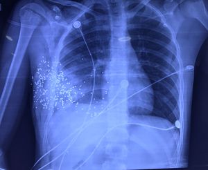 Accidental bullet shot penetrating the chest of a young 19 year old male patient. The patient had a CT Scan and urgent thoracotomy