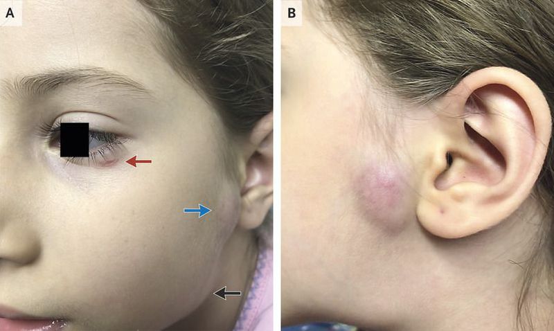 A 5-year-old girl presented to the emergency department with a preauricular mass and submandibular adenopathy on the left side of her face that had been visible for 2 months. An excoriation below the left eye (Panel A, red arrow), a fluctuant, tender preauricular mass (Panel A, blue arrow; and Panel B), and submandibular adenopathy (Panel A, black arrow) were observed on physical examination. The patient had no history of fevers, and her vision was unaffected. She frequently played with a cat at home. The preauricular mass was aspirated, and a purulent, brownish drainage was obtained. Given the high clinical suspicion of cat scratch disease, the patient was discharged with a 5-day prescription for oral azithromycin. The results of culture of the aspirate in chocolate agar were negative, but histopathological analysis of the aspirate revealed an inflammatory infiltrate with necrosis. Bacilli were detected on Warthin–Starry staining. Serologic tests were positive for the causative bacterium, Bartonella henselae(IgM titer, >1:1024; IgG titer, >1:20). Parinaud’s oculoglandular syndrome, a manifestation of cat scratch disease, is characterized by involvement of the conjunctiva or the area around the eye, in association with preauricular lymphadenitis on the same side. The syndrome can occur when the inoculation site involves the conjunctiva or eyelid. On follow-up 2 months after treatment, the patient’s preauricular and submandibular adenopathy had resolved.