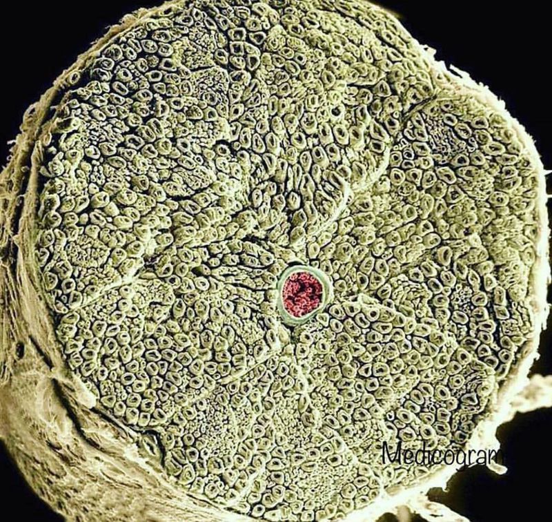 The nerve is composed of numerous bundles of myelinated axons. In the centre is a blood vessel filled with red blood cells. The human body contains 31 paired spinal nerves. The spinal nerves connect the brain/spinal cord with the muscles of our body. â¢Today medicogram is going to present you the physiological basis of how this intuitive system of nerves works within our physique! When you want to move your leg, Signals from your leg passes through the posterior root ganglion (Sensory) of the spinal nerve to the spinal cord, reaches the higher centres of the brain, Processed there and comes back through the descending tracts of the spinal cord, forwarded to the anterior root ganglion (Motor) of the same spinal nerve (which innervates the muscles of your leg) and induces the desired movements in your leg.