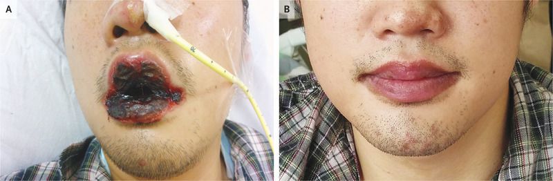 A 26-year-old previously healthy man presented to the emergency department with a 3-day history of fever, dry cough, and nonpruritic rash. A physical examination was notable for crackles on the left side of the chest and a macular, targetoid rash on his hands and feet, including the palms and soles. A radiograph of the chest showed infiltrates in the left lower lung field. Over the next 3 days, severe mucositis developed that involved the lips, buccal mucosa (Panel A), conjunctivae, and urethral meatus. Bacterial cultures of the blood and sputum and a polymerase-chain-reaction (PCR) test for herpes simplex virus in a specimen from the oral lesions were negative. Testing for Mycoplasma pneumoniae by PCR of the nasopharyngeal aspirate and for serum IgM antibody was positive. Mycoplasma is commonly associated with exanthems. In this case, the clinical presentation was consistent with Mycoplasma pneumoniae–induced erythema multiforme, also referred to as mycoplasma-induced rash and mucositis. Given the severity of the mucosal involvement, a nasogastric tube was placed for nutrition and for administration of medications. After approximately 2 weeks of treatment with doxycycline, the patient had complete resolution of his respiratory illness and mucositis (Panel B).