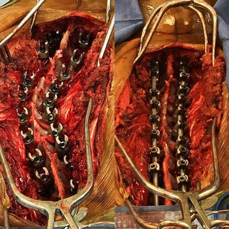 Scoliosis is a sideways curvature of the spine that occurs most often during the growth spurt just before puberty. While scoliosis can be caused by conditions such as cerebral palsy and muscular dystrophy, the cause of most scoliosis is unknown. The curve is usually "S"- or "C"-shaped.In some the degree of curve is stable, while in others it increases over time. Mild scoliosis does not typically cause problems, while severe cases can interfere with breathing. Diagnosis is usually confirmed with plain X-rays. Surgical correction is done in curvatures of over 45 degrees and typically involves the use of modern instrumentation systems in which hooks and screws are applied to the spine to anchor long rods, ensuring the correction of the curvature and its stability over time.