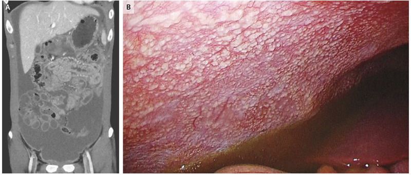 A previously healthy 24-year-old man presented to the emergency department with a 1-month history of abdominal distention, abdominal pain, and fever. On physical examination, he was noted to have bulging flanks with a fluid wave. Analyses of ascitic fluid revealed a predominance of lymphocytes, a high protein level that was similar to that in serum, and an adenosine deaminase level of 150 U per liter (reference range, 8.6 to 20.5). The results of acid-fast staining and polymerase-chain-reaction (PCR) testing for Mycobacterium tuberculosis were negative. A computed tomographic scan obtained after the administration of contrast material showed a large amount of ascites, a thickened peritoneum, and multiple enlarged mesenteric lymph nodes (Panel A). Exploratory laparoscopy revealed numerous white, miliary nodules on the peritoneum and omentum (Panel B). Caseating granulomas with Langhans giant cells were detected on peritoneal histopathological analysis. A specimen of an omental lesion was obtained on biopsy, and the results of PCR testing and culture of the tissue were positive for M. tuberculosis. A test for infection with the human immunodeficiency virus was negative. The sensitivity of ascitic-fluid culture for M. tuberculosis is low, and the diagnosis can require peritoneal biopsy. This patient was treated with isoniazid, rifampin, ethambutol, and pyrazinamide for 2 months, followed by isoniazid and rifampin for 4 months. The ascites and associated symptoms resolved.