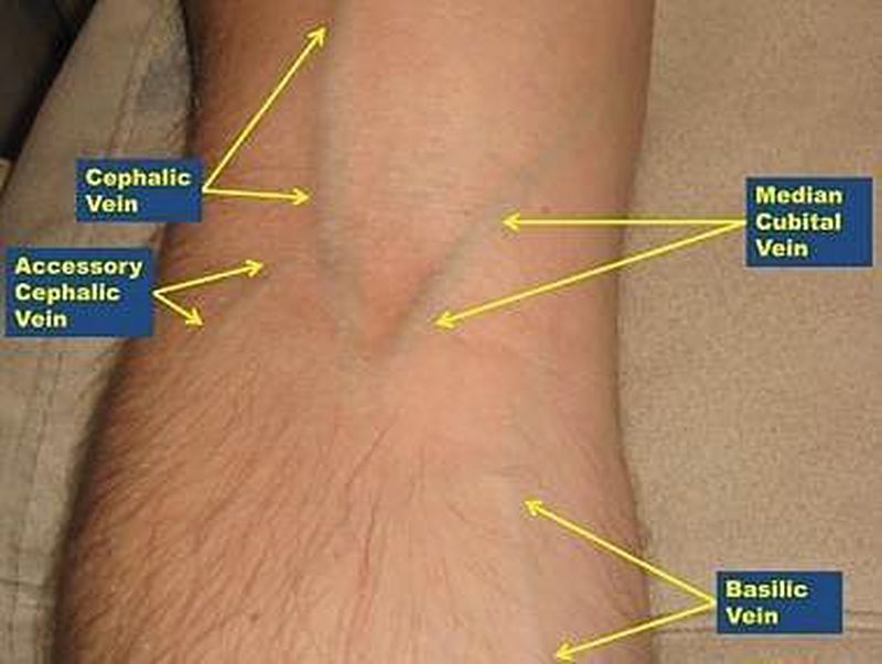 - Here is a labeled arm showing the antecubital veins. The antecubital fossa contains four veins (see the image). Of these, the median cubital vein is usually the vein of choice for phlebotomy: it is typically more stable (less likely to roll), it lies more superficially, and the skin overlying it is less sensitive than the skin overlying the other veins. Phlebotomy is a technique in which a needle is temporarily inserted into a vein to provide venous access for venous blood sampling or infusion. Contraindications for phlebotomy include the following: Evidence of cellulitis or abscess, venous fibrosis on palpation, presence of a hematoma, presence of a vascular shunt or graft, and presence of a vascular access device.
