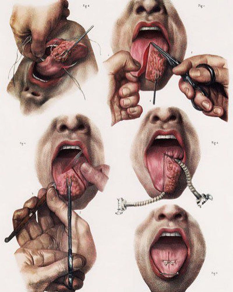This is an illustration demonstrating partial removal of a cancer tongue from 1841. This type of procedures was done with no anesthesia, can you imagine being fully awake while your face is being cut? Notice that, In that era there were no antibiotics as well.