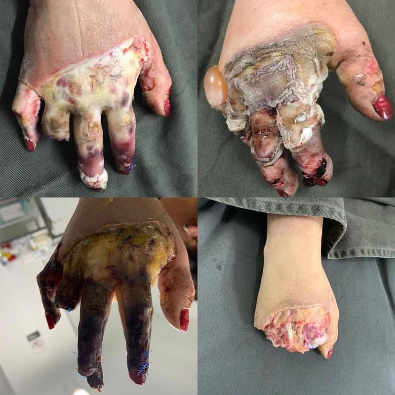 Female patient got her hand trapped in between tow heavy duty/ high pressure rollers which were also heated. Unfortunately only the thumb survived after debridement. Every time a mangled tissue gets exposed to heat/burned, the chances of survival drop dramatically, this is due to poor tissue blood supply. The palm of the hand comprises only one percent of the body surface area. Despite this, a burn of the hand can represent a serious short- or long-term disability. Credit: @reconst.surg.col