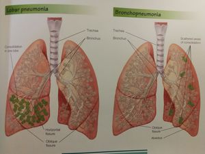 In bacterial pneumonia, an infection triggers alveolar ianflammation and edema. This produces an area of low ventilation with normal perfusion. Capillaries become engorged with blood, causing stasis. As the alveocapillary membrane breaks down, alveoli fill with blood and exudates, resulting in atelectasis. In viral pneumonia, the virus attacks bronchial epithelial cells, causing ianflammation and desquamation. The virus also invades mucous glands and globet cells, spreading to the alveoli, which fill with blood and fluid.