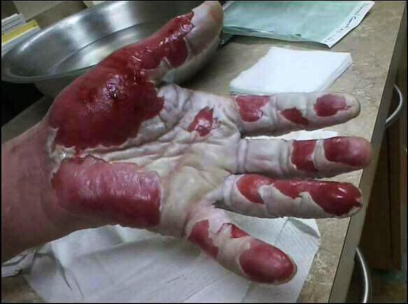 The result of a radiator exploding while the patient was working on his car, leaving his left hand with serious burns!! His hand was covered in huge blisters which were extremely painful. A blast or explosion happens when a chemical conversion occurs that changes a solid or liquid to highly pressurized gases in an extreme manner with substantial instantaneous release of gas and heat. This rapid expansion of gases compresses the surrounding air, creating incredible waves of pressure that move out from the point of explosion. This blast wave dissipates and disperses as it encounters more stable air and moves across solid or liquid surfaces. The friction of the blast wave encountering the stable air and other stationary objects aids in slowing and dispersing it. However, the closer an object or person is to the point of the explosion, the more likely this incredible energy (which includes a thermal component) will be absorbed by that person or item. Though certain chemical reactions are hotter than others, all blast waves include a thermal component, causing extensive 2nd and 3rd degree burn injuries.