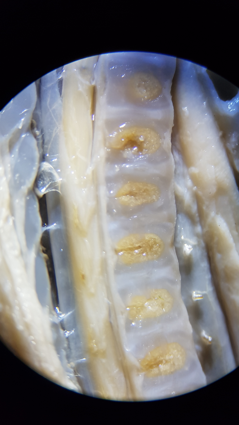 Núcleos de osificación de la columna vertebral en un feto de 26 semanas.