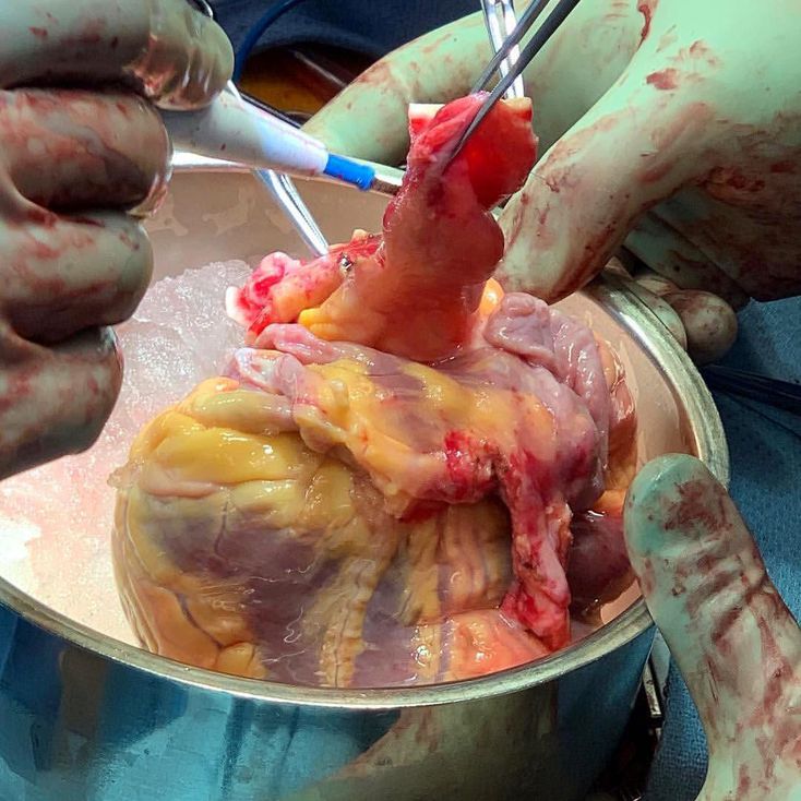 Orthotopic heart transplantations are some of our favorite procedures in the field of cardiothoracic surgery! After establishing general endotracheal anesthesia with standard monitors, arterial line, central line, large bore peripheral intravenous access, and transesophageal echocardiography, the remainder of the procedure is carefully coordinated with the transplant team procuring the donor heart. Minimizing the time the heart spends outside of a body (the "ischemic time") is incredibly important! Cardiothoracic surgeons begin with a midline chest incision followed by sternotomy and pericardiotomy. After the patient is systemically heparinized, the ascending aorta is cannulated followed by a separate superior and inferior vena caval cannulations ("bicaval" venous cannulation). Cardiopulmonary bypass (CPB) is initiated once the donor organ is "nearby" but the recipient's heart is not actually explanted until the donor heart is visualized. Excision of the recipients diseased heart takes place. With the donor heart still out of the chest the first suture is placed on the left atrium, starting at the site of the left superior pulmonary. After a couple of stitches have been placed, the heart is put in the chest, pulled to the left by the assistants hand and the suture tightened. The orientation is determined by this first left atrial suture. If it is correct, the other structures pulmonary artery and aorta, and the two cavae, lie adjacent to each other, and can simply be anastomosed end to end with running sutures. Length must be carefully judged; both redundant tissue, which leads to kinking, and over-trimming, with tension on suture lines, must be avoided. To reduce the so-called warm or implantation time, some surgeons will only do the left atrial and aortic anastomoses, doing all the right-sided suture lines with the heart re-perfused and beating. The heart is reperfused after removal of the cross-clamp. Both atrial and ventricular pacemaker wires are placed and exteriorised. The heart is slowly weaned off cardiopulmonary bypass. Once off bypass, two mediastinal drains are placed and protamine administered. The chest is closed in the standard fashion.